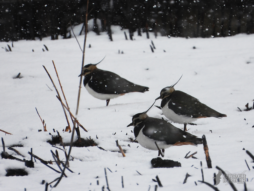 残念ながらタゲリの特徴である緑黒色の羽は雪の降る中では鮮明にみることは出来ませんでしが、それでも普段は警戒心が強く近くで見ることができないタゲリ達との貴重な出会いでした。双眼鏡を握る手はかじかんでいましたが・・・