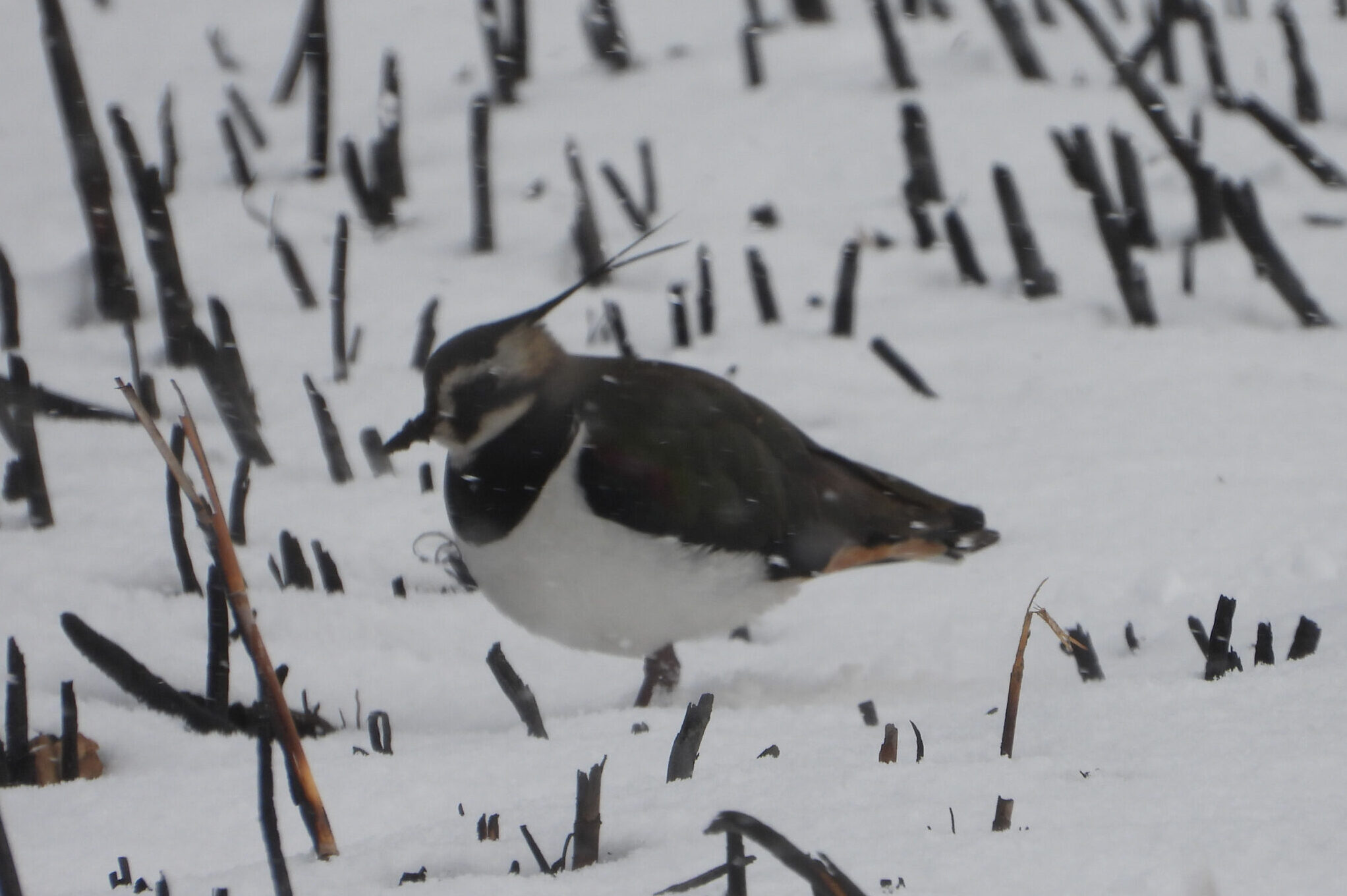 残念ながらタゲリの特徴である緑黒色の羽は雪の降る中では鮮明にみることは出来ませんでしが、それでも普段は警戒心が強く近くで見ることができないタゲリ達との貴重な出会いでした。双眼鏡を握る手はかじかんでいましたが・・・